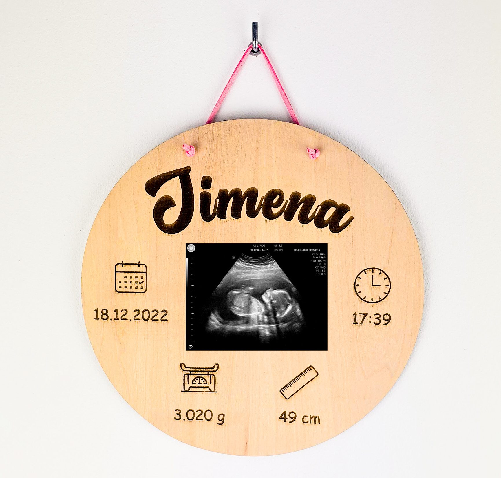 Además en este Natalicio circular para foto, puedes poner la foto de la ecografía o de su primer día, lo dejamos a tu elección pero te dejamos un huequito de 7×10 para que lo decidas.
